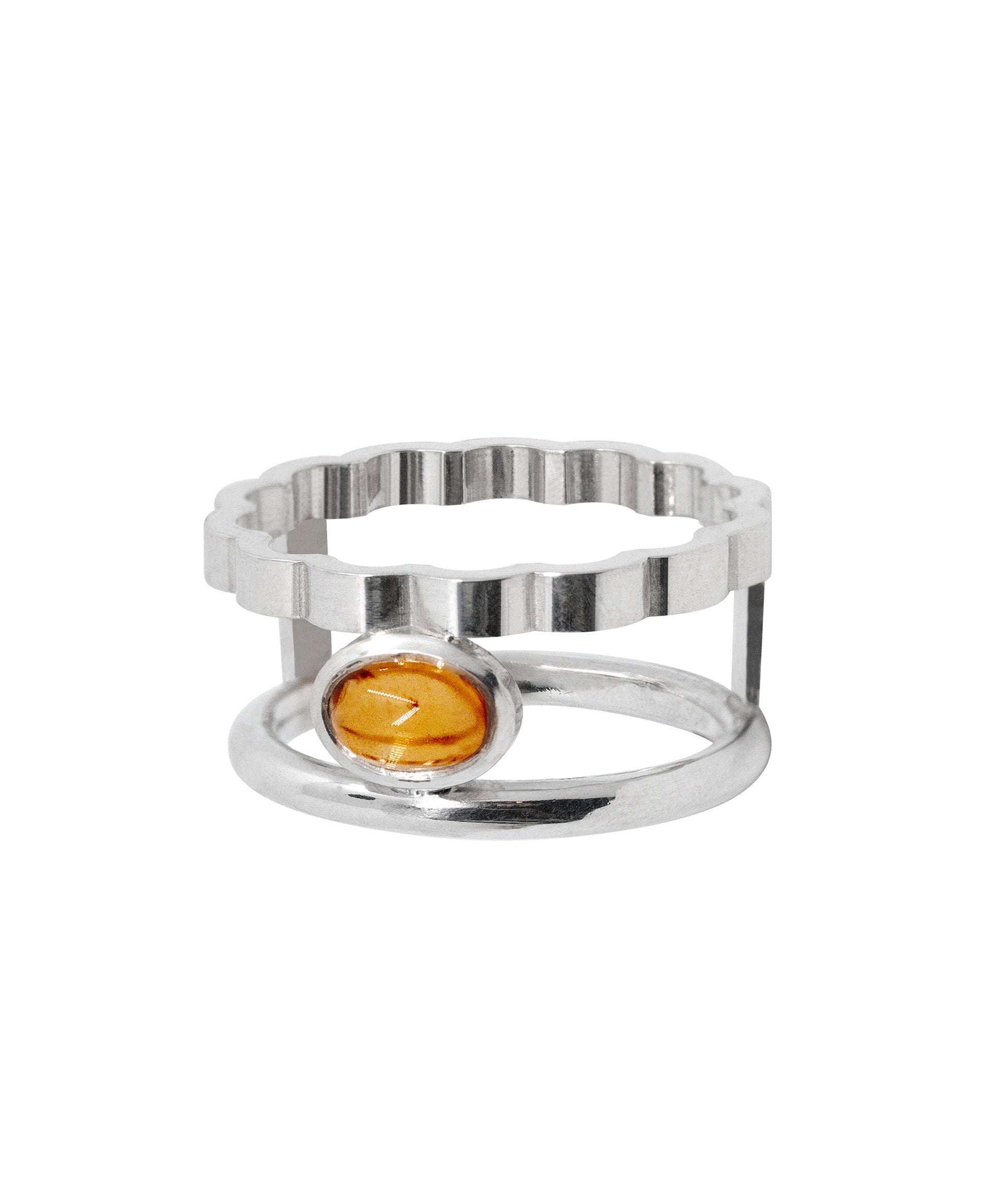 This double ring captures that moment in silver and gold. A round band, like the smooth surface of a lime, glides over your finger. Representing the inside of the fruit, the ribbed, flower-like band sits just above your skin—teasing without touching.