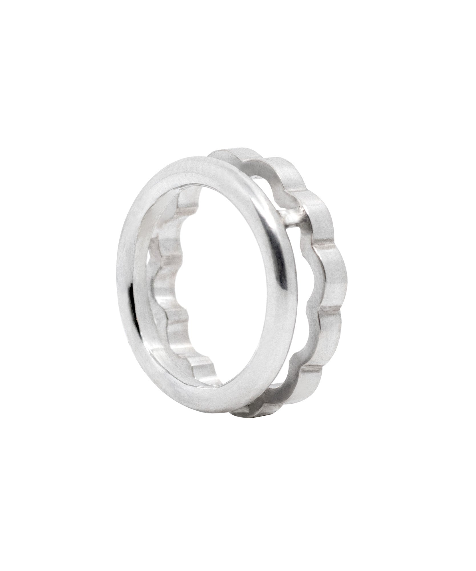This double ring captures that moment in silver and gold. A round band, like the smooth surface of a lime, glides over your finger. Representing the inside of the fruit, the ribbed, flower-like band sits just above your skin—teasing without touching.